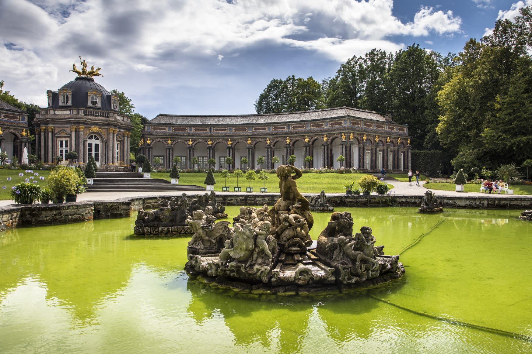 Linderhof Palace, the smallest of the three palaces King Ludwig II had built and the only one he lived to see fully completed. Diverse artistic features include Moorish architecture and formal gardens inspired by France’s Versailles.